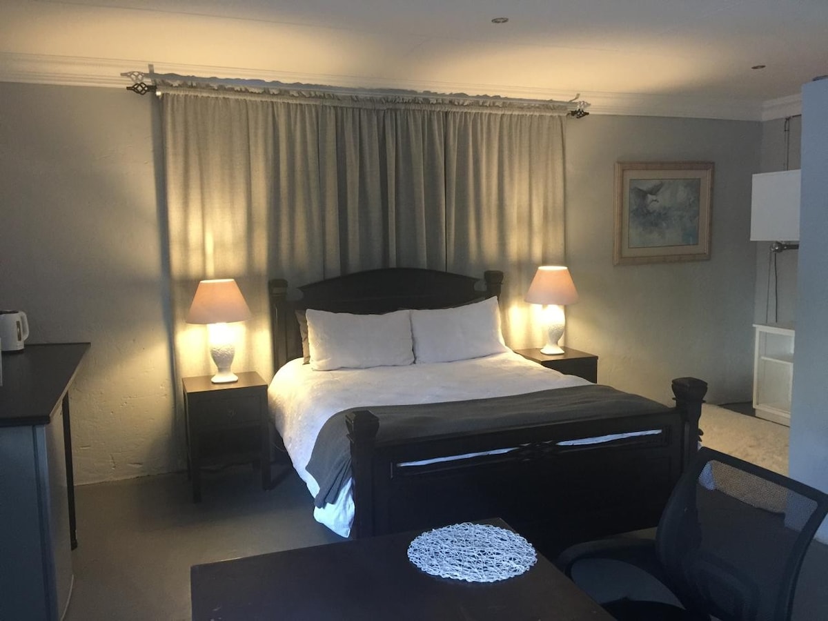 Secure cottage with own entrance in beautiful garden setting - lots of birds and guinea fowl. 7min from the N1, 5min to Flora Clinic, shopping centre and bus stop. Bedroom has an ensuite bathroom with shower and bath. Open plan living area (land kitchen. Parking for 1 car with beams linked to alarm, tandem parking for 2nd car. In November you can enjoy picking white mulberries from our tree. We look forward to welcoming you!