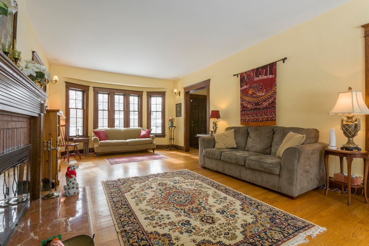 Our cozy, 1920's home is located in the Cathedral district in Joliet. 3 minutes away from the Haley Mansion and 6 minutes away from the Jacob Henry Mansion. You get the whole main floor for yourself and your guest(s) with your own entrance through the front door that has a keypad door lock. I, along with my two mini dachshund puppies, stay in the basement. We have our own entrance through the back. You can park right outside on the street. So there is plenty of parking.